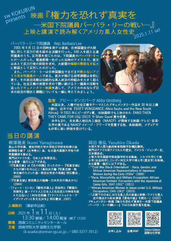 2025/1/11 学部主催 岡田泰弘・柳澤幾美講演会(映画『米国下院議員バーバラ・リーの闘い─権力を恐れず真実を』上映付)を開催しました