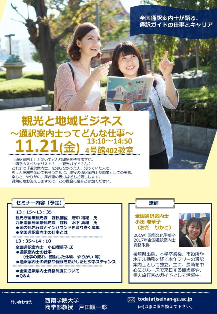 観光庁国際観光課、九州運輸局国際観光課による説明に加え、現役の全国通訳案内士である小田理華子さん(2018年度国際文化学部卒業生)が、職業としての実態、楽しさ、やりがい、舞台裏の苦労など語ってくれます。ふるってご参加ください。